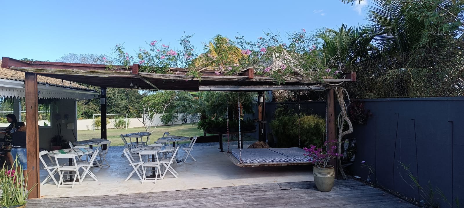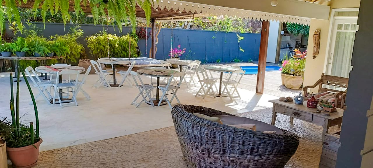 • Área coberta tipo salão de festas com mesas